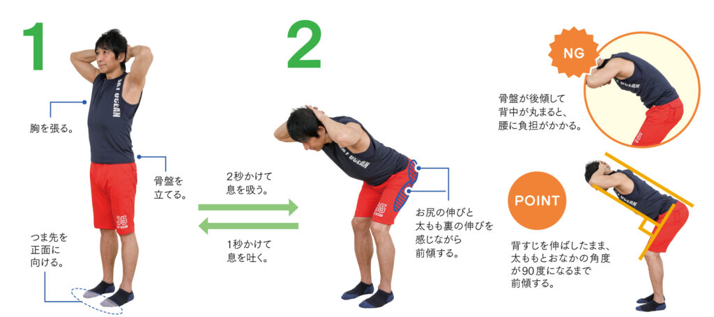 2.息を吸いながら2秒で膝を軽く曲げつつ前傾し、息を吐きながら1秒で1に戻る。